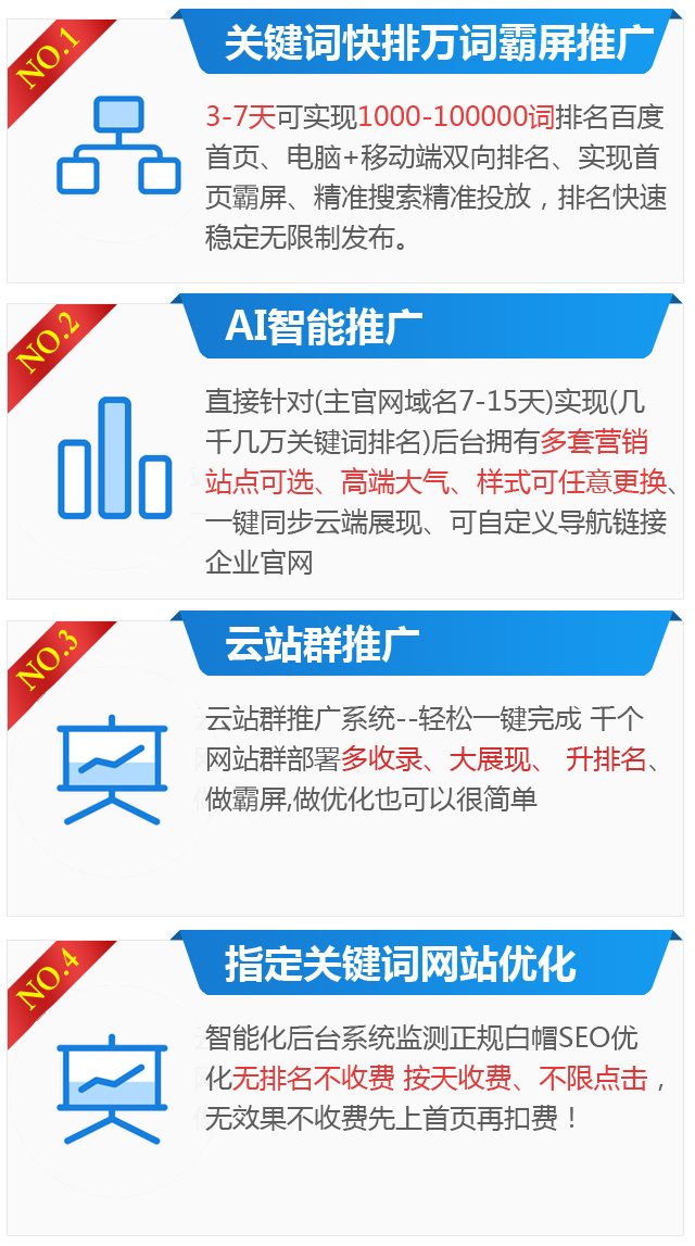 答:一个行业我们只合作2家,关键词这么多,也并不是每个都一样的。再说我们的技术是非常有保障的,要把你做上去,就必须要把别人挤下来,而且我们可以添加很多个关键词。而且合作后有后台可以随时观看检测你的在线排名。我们每天进行关键词更新,如产品关键词更新,只要你想做什么关键词,你给我们就可以了,我们会在3-7天就可以帮你做到首页。