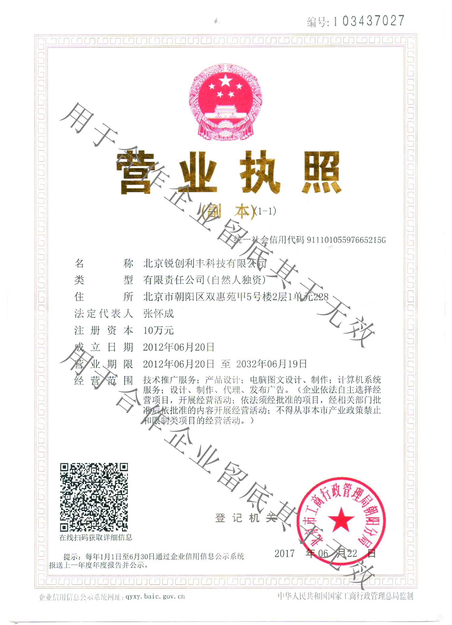 北京锐创利丰科技有限公司 三证合一